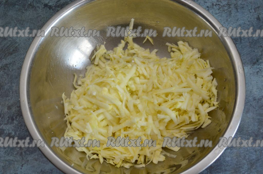 В глубокую миску натереть на крупной тёрке кабачок. Сразу руками отжать сок из кабачка (сок для приготовления оладий не потребуется).