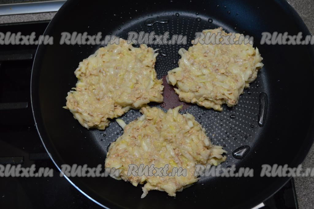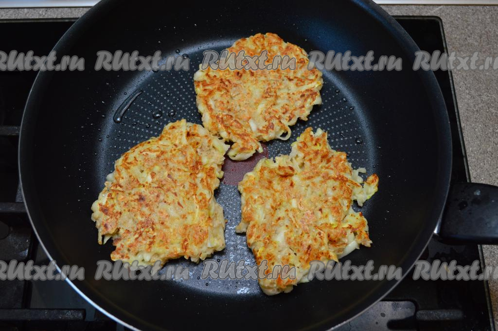 Разогреть сковороду с добавлением растительного масла. Выкладывать на сковороду по 1 столовой ложке кабачково-овсяной массы, хорошо разравнивая и придавая округлую форму.