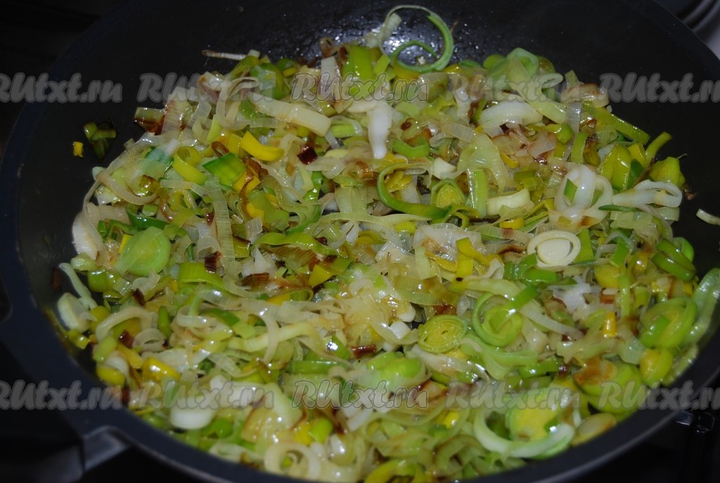 Нарезать лук-порей тонкими кольцами, выложить на сковороду, добавить оливковое масло.