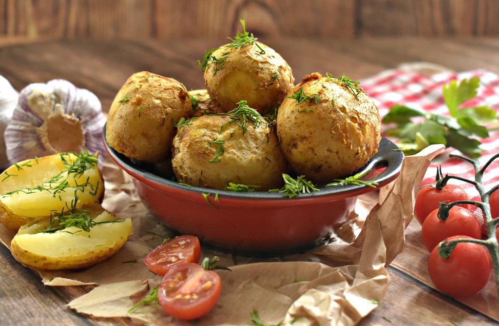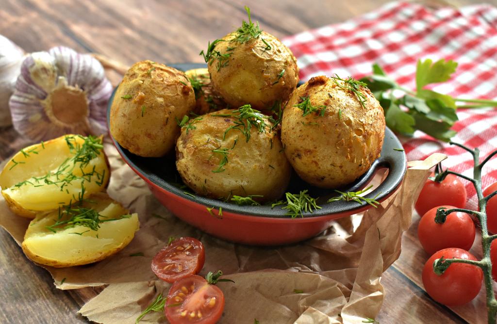Готовое блюдо достаём из духовки, посыпаем нарезанным укропом. Вкусная, ароматная молодая картошка, запечённая в кожуре с чесноком, станет отличным гарниром к мясу, птице, рыбе. Такой картофель можно подать и в качестве основного блюда, дополнив свежей зеленью или овощным салатом.