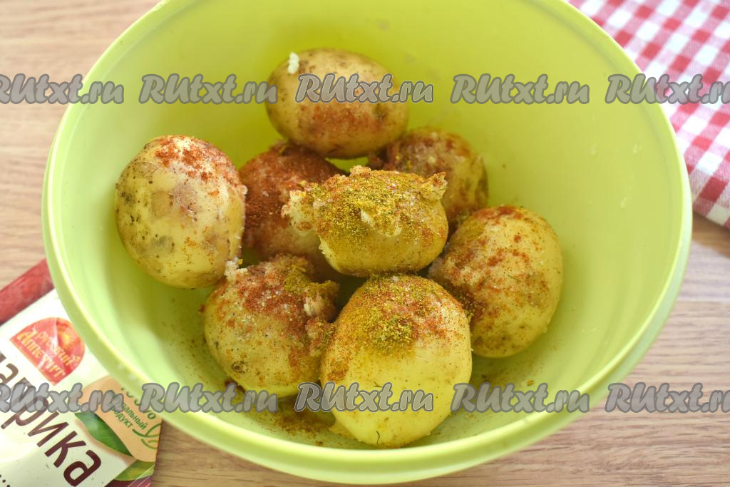 К картошке всыпаем соль по вкусу, молотую паприку и готовую приправу для блюд из картофеля.