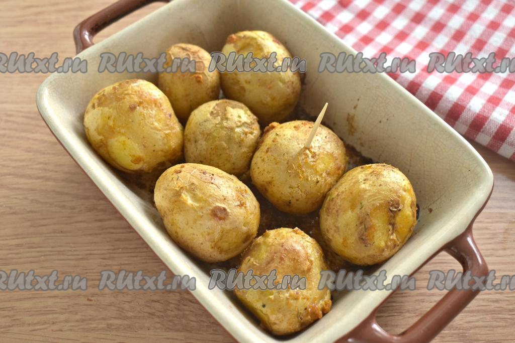 Ставим форму с молодой картошкой в кожуре с чесноком в духовку, прогретую до 180 градусов. Запекаем примерно 35 минут. Готовность можно проверить, проколов картофель зубочисткой или ножом (если картофель легко прокалывается, значит он уже готов). Продолжительность запекания зависит от сорта картошки и величины клубней.