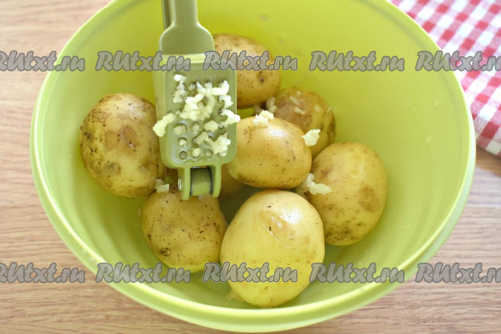Зубчики чеснока очищаем, пропускаем через пресс (или натираем на мелкой тёрке) и выкладываем к картофелю.