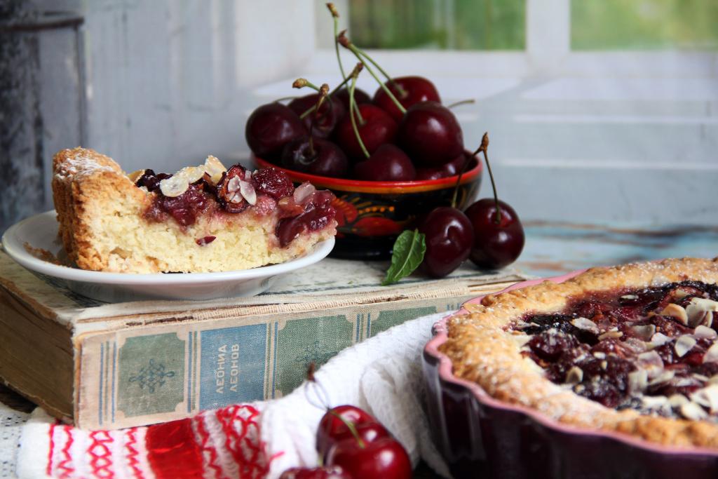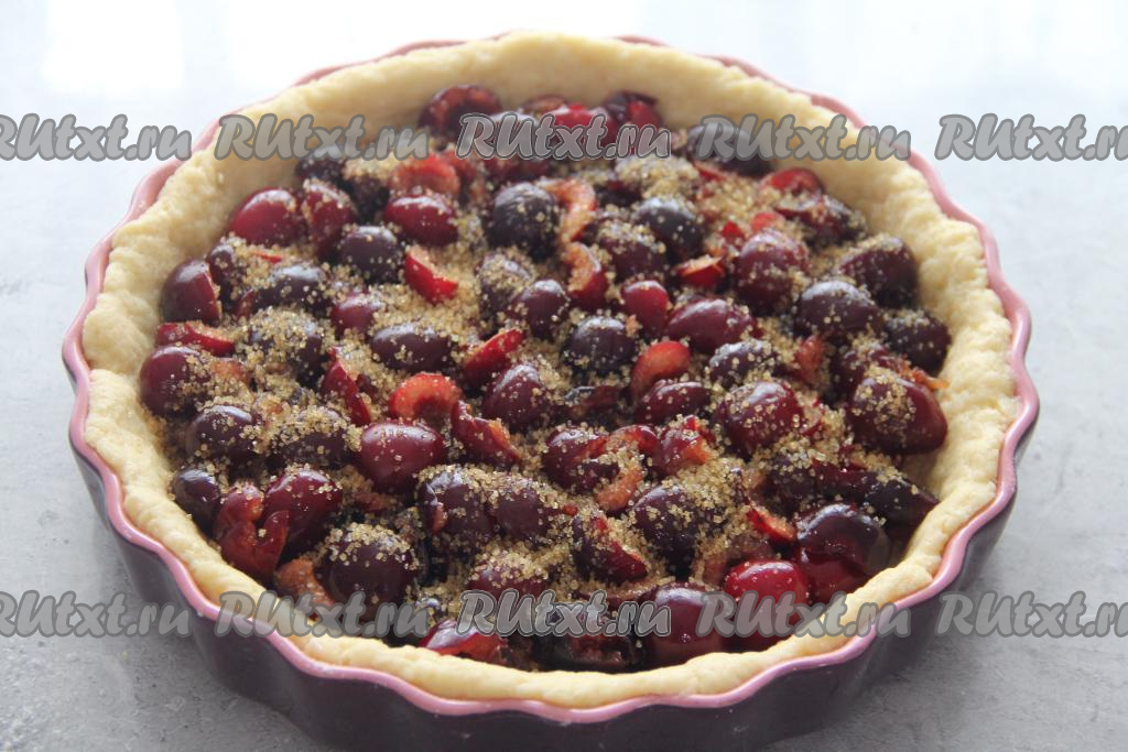 Затем выложить начинку (у меня в качестве начинки черешня без косточек, я её присыпала 1 столовой ложкой коричневого сахара). Выпекать пирог из песочного теста, замешанного на маргарине, нужно в духовке, разогретой до 190 градусов, минут 50 (до подрумянивания теста).