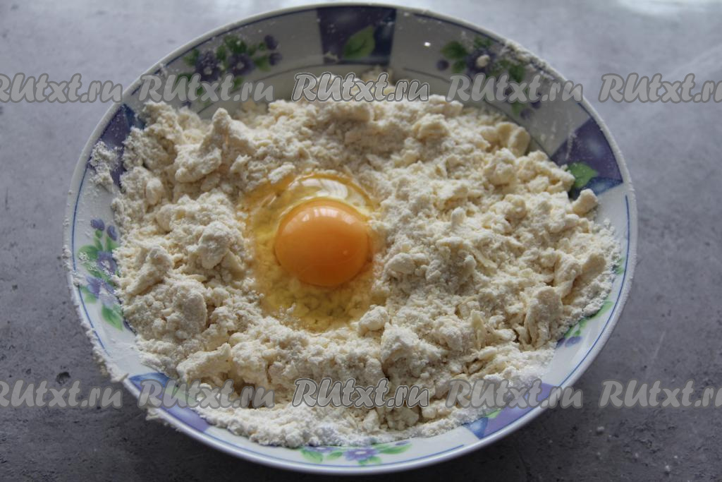К получившейся крошке добавить яйцо.