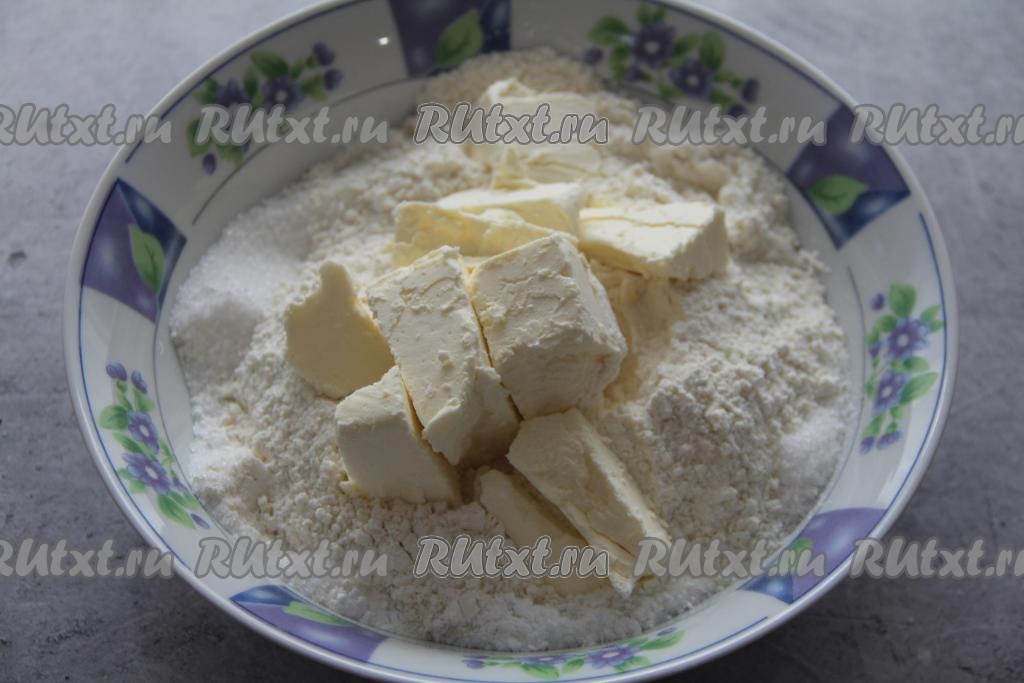 Для замешивания песочного теста для пирога нужно в миску всыпать просеянную муку, добавить соль, сахар и разрыхлитель, перемешать сухие ингредиенты.