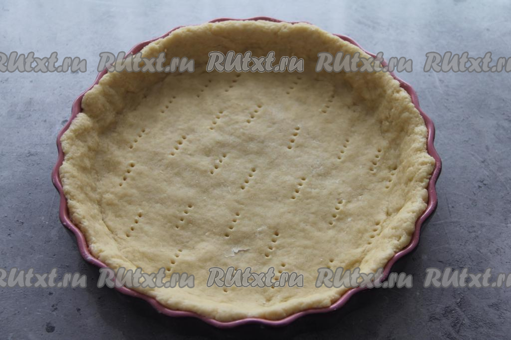 Пока песочное тесто охлаждается, можно подготовить начинку для пирога. По прошествии часа достать тесто из холодильника, выложить его в форму для выпечки (я взяла форму диаметром 26 сантиметров), сформировав невысокий бортик. Тесто на дне формы наколоть вилкой (благодаря проколам, тесто не будет вздуваться в процессе выпечки).
