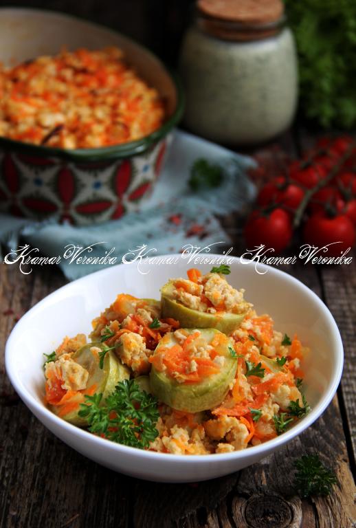 Поверх кабачков выложить фарш с овощами.