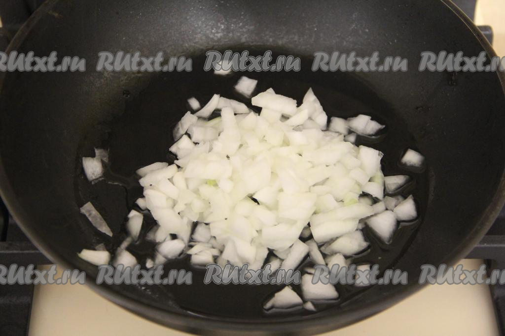Мелко нарезанный лук выложить в сковороду, разогретую с небольшим количеством растительного масла. На среднем огне обжарить лук, иногда помешивая, до прозрачности (примерно 2-3 минуты).
