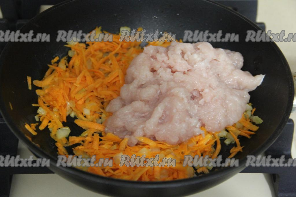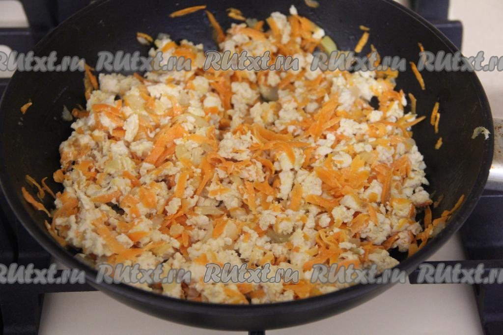 Обжарить фарш с овощами минут 8-10, постоянно разбивая комочки мяса.