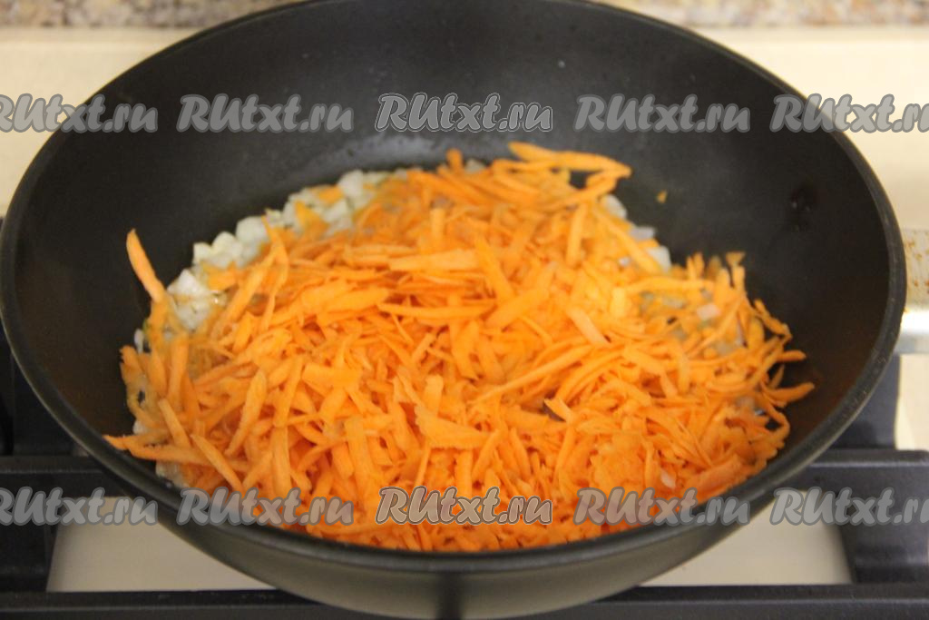 Когда лук станет прозрачным, выложить натёртую на крупной тёрке морковку, перемешать и обжаривать овощи, периодически помешивая, до мягкости моркови (минут 5).