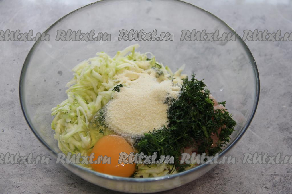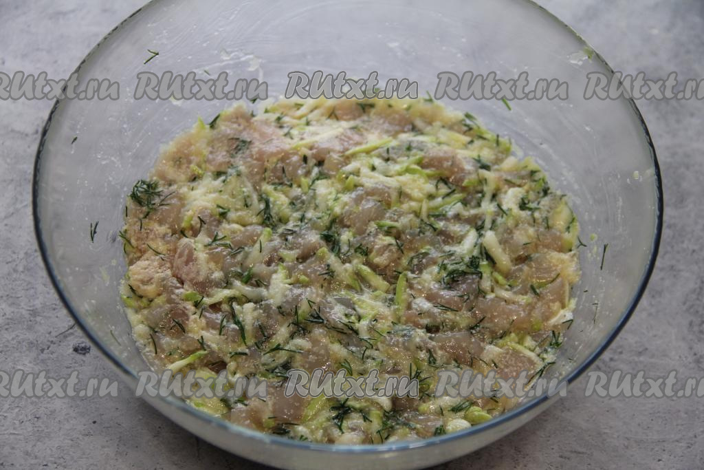 Отжать из натёртого кабачка лишний сок (сок нам не понадобится). В миске соединить нарезанное мясо и натёртый кабачок, отжатый от лишней жидкости.