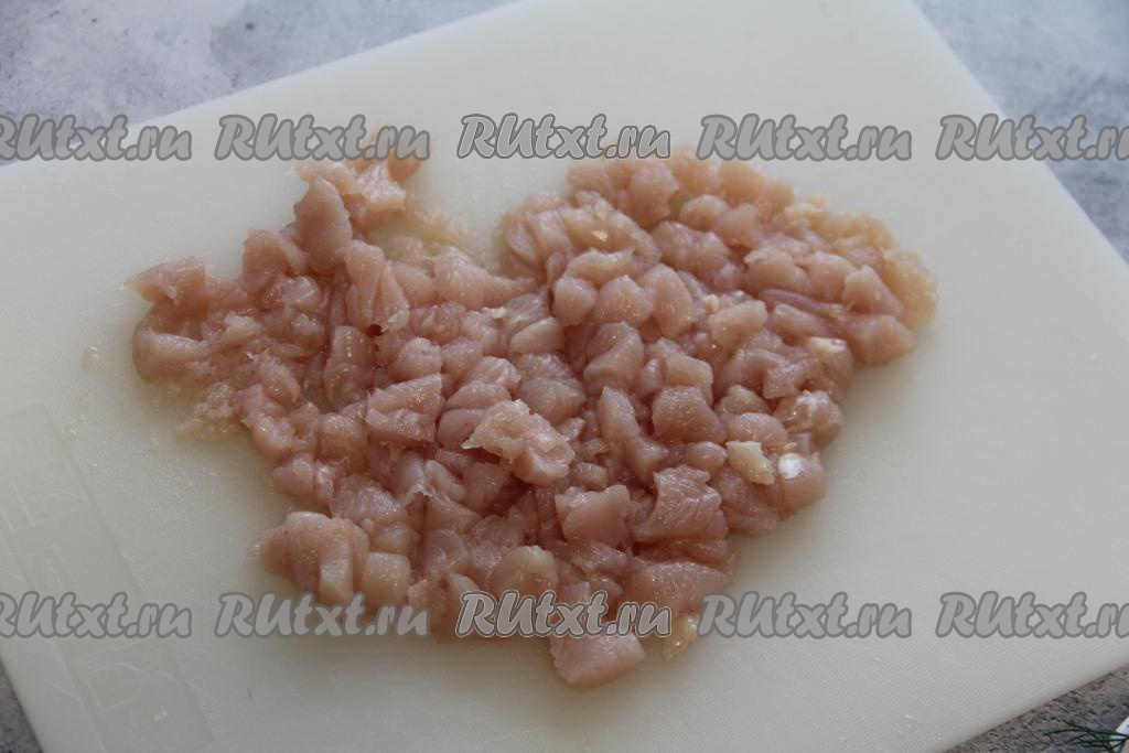 Вымыть куриное филе, дать ему немного обсохнуть, а затем нарезать на маленькие кусочки острым ножом.