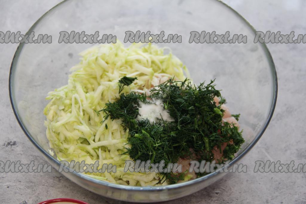 В миску с нарубленным мясом и кабачками добавить мелко нарезанный укроп и соль.