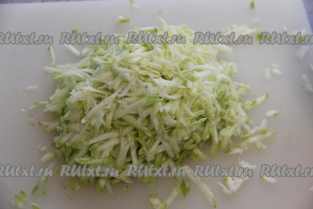 Кабачок вымыть и натереть на крупной тёрке. Я использовала молодой кабачок, шкурка у него мягкая, семечки мелкие, поэтому я его натирала, не удаляя семечки и кожуру.