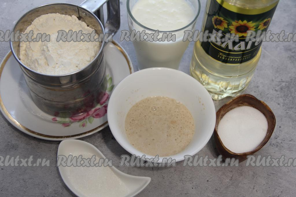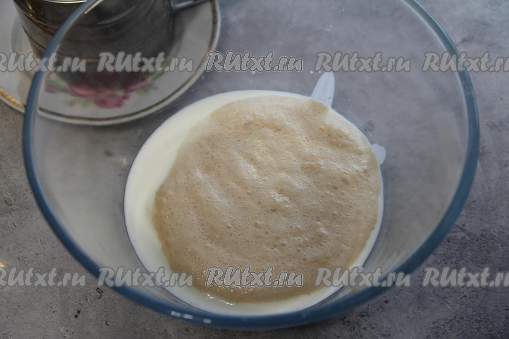Подготовить продукты. Первым делом приготовим дрожжевую опару, для этого в воде, температура которой должна быть 38-40 градусов, нужно растворить дрожжи и оставить на 10 минут (на поверхности опары должна появиться пенная шапочка - это означает, что дрожжи начали работать).