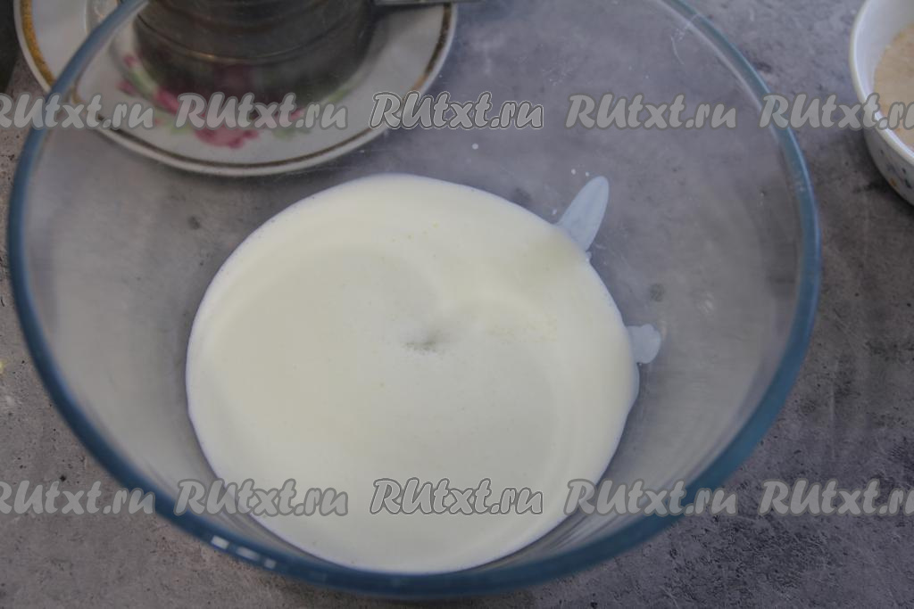 Кефир подогреть до 38-40 градусов (я подогрела в микроволновке), перелить в объёмную миску.