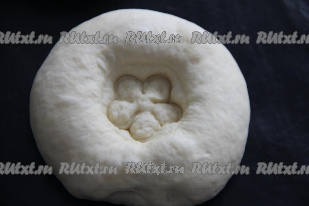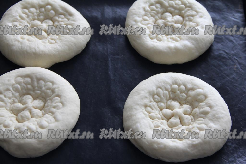 Разделить тесто на 4 части. Сформировать круглые лепёшки и выложить их на противень, застеленный ковриком (или пергаментом) для выпечки. Лепёшки нужно выкладывать на расстоянии друг от друга. Оставить минут на 20, затем сформировать рисунок в серединке, хорошо продавливая середину лепёшки.