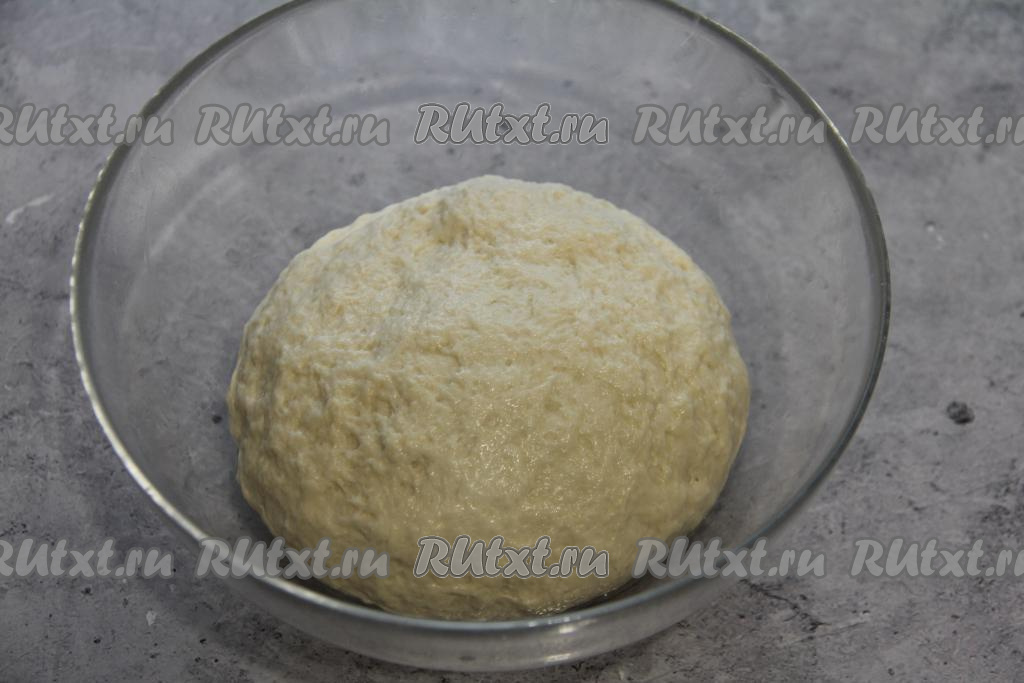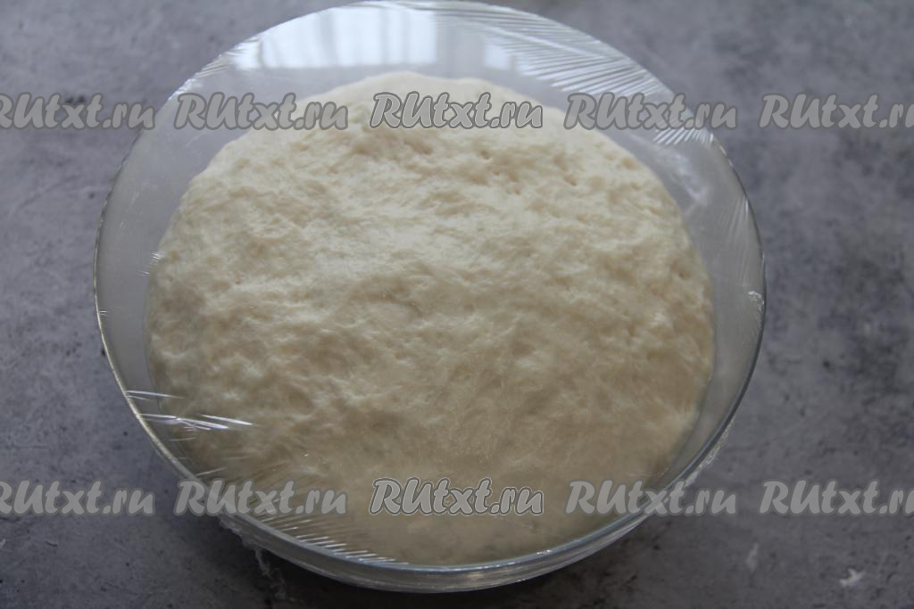 Тесто хорошо поднимется. Обмять его, снова затянуть миску плёнкой (или прикрыть полотенцем) и оставить ещё на 40 минут. Затем третий раз обмять тесто.