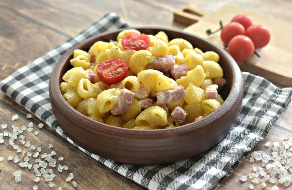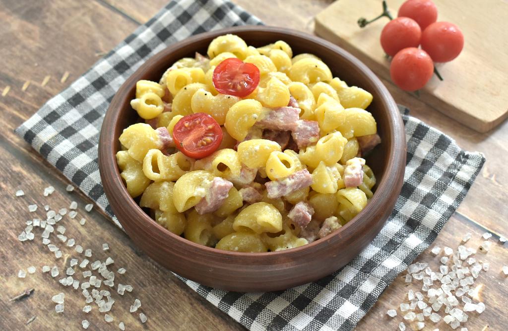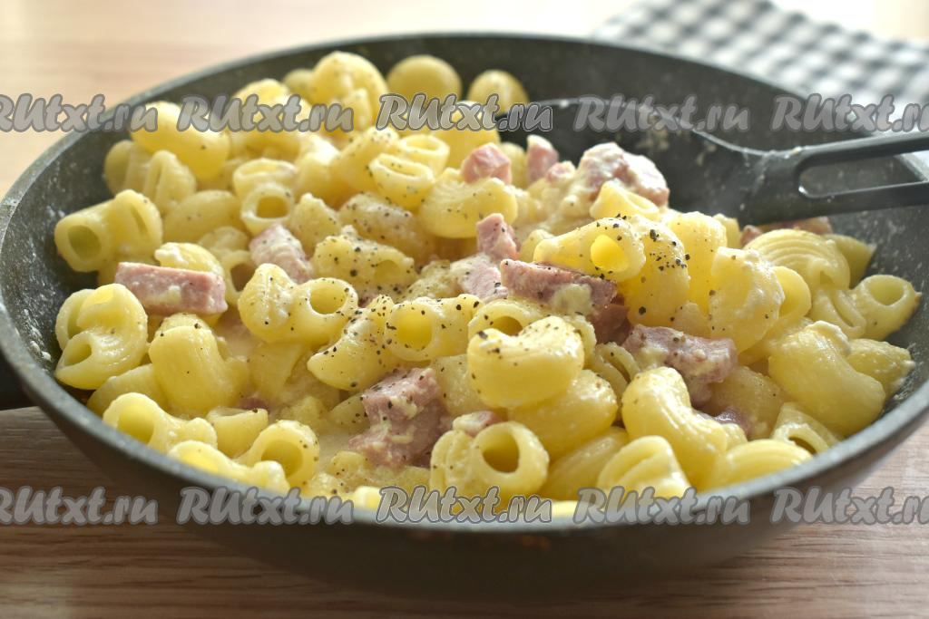 Сытные, аппетитные, вкусные макароны с ветчиной и сыром в сливочном соусе сразу подаём к столу.