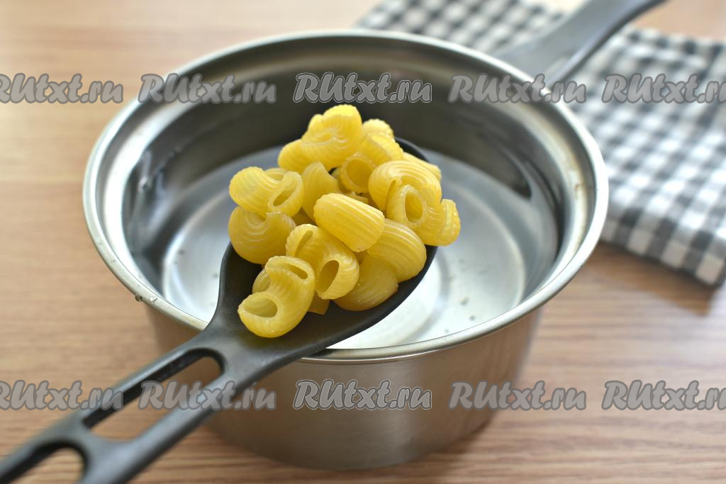 В кастрюлю наливаем примерно 1,5 литра холодной воды (из расчёта, что на 100 грамм макарон требуется 1 литр воды). Воду немного солим, доводим до кипения. В кипящую воду выкладываем макаронные изделия, перемешиваем и после закипания варим 7-9 минут (точное время варки смотрите на упаковке макаронных изделий, которые вы готовите).