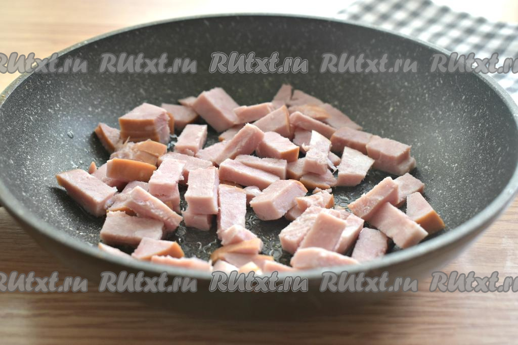 На сковороде разогреваем растительное масло, выкладываем ветчину, нарезанную на брусочки, и обжариваем минут 5, периодически помешивая. Если ветчина очень жирная, тогда её можно обжаривать без добавления масла.