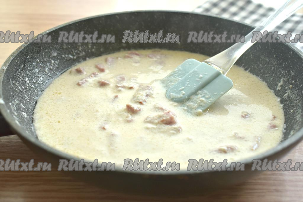 Перемешиваем сыр с ветчиной и сливками, доводим до кипения, помешивая, на среднем огне. Сыр за это время расплавится (мне на это потребовалось 3 минуты), получится сливочный соус.