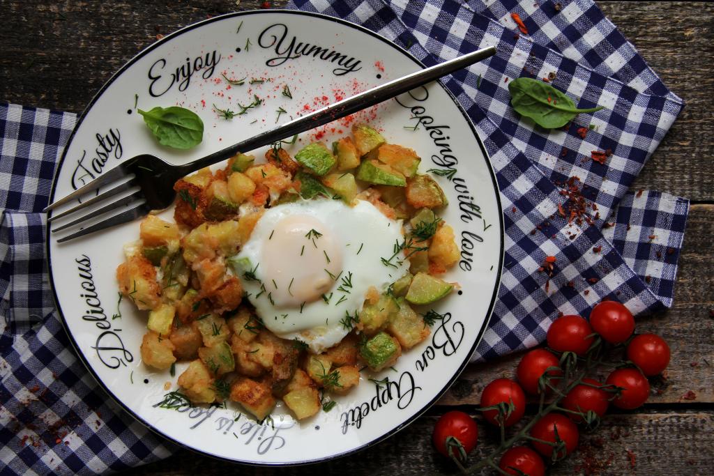 Вкусную, аппетитную, сытную яичницу, приготовленную с кабачками, переложить со сковороды на тарелки и в горячем виде подать к столу, присыпав, по желанию, рубленной зеленью.