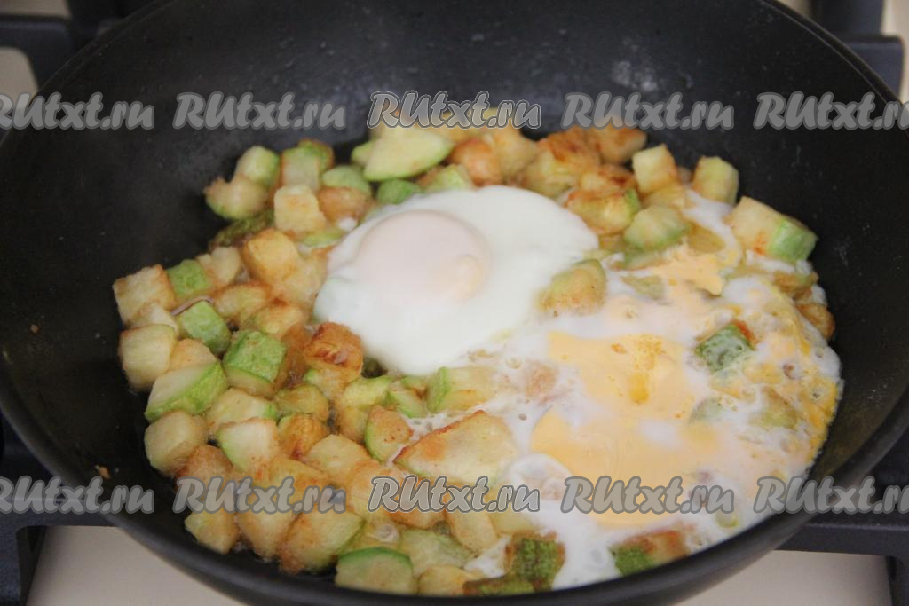 Разровнять обжаренные кабачки так, чтобы они лежали ровным слоем на сковороде, и вбить яйца. Яичные желтки немного присолить.