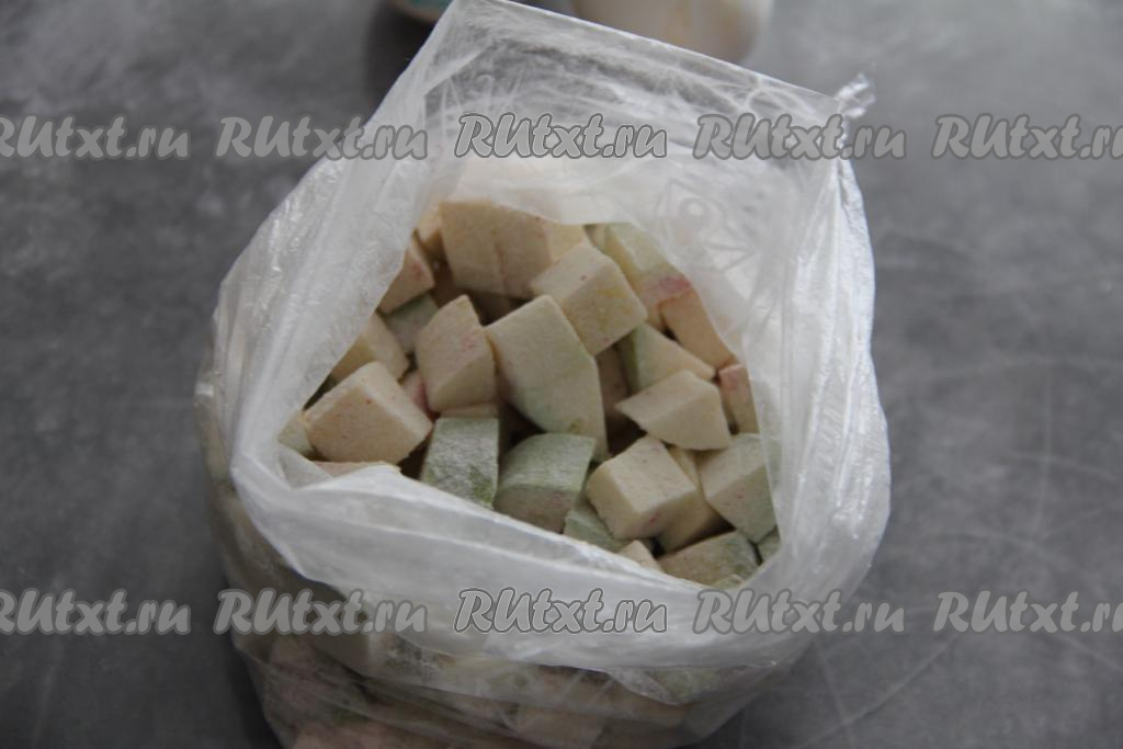 250 грамм подготовленного кабачка нарезать на кубики размером 1 на 1 сантиметр, выложить в обычный целлофановый пакет.