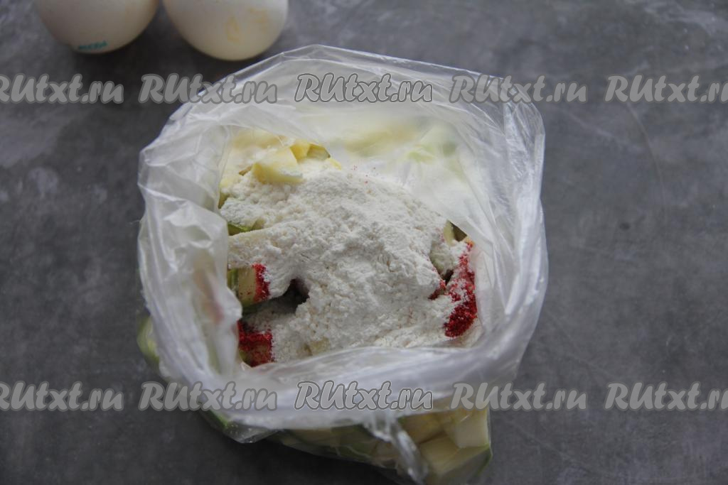 Завязать пакет и хорошо встряхнуть несколько раз, чтобы все кабачки равномерно покрылись смесью муки и специй.