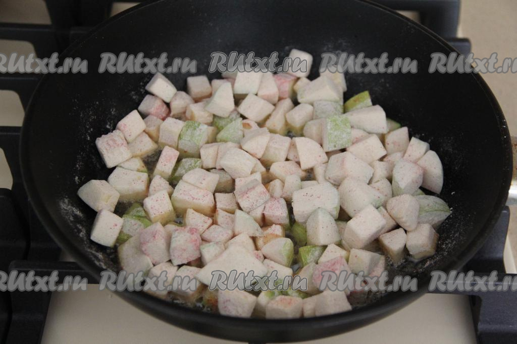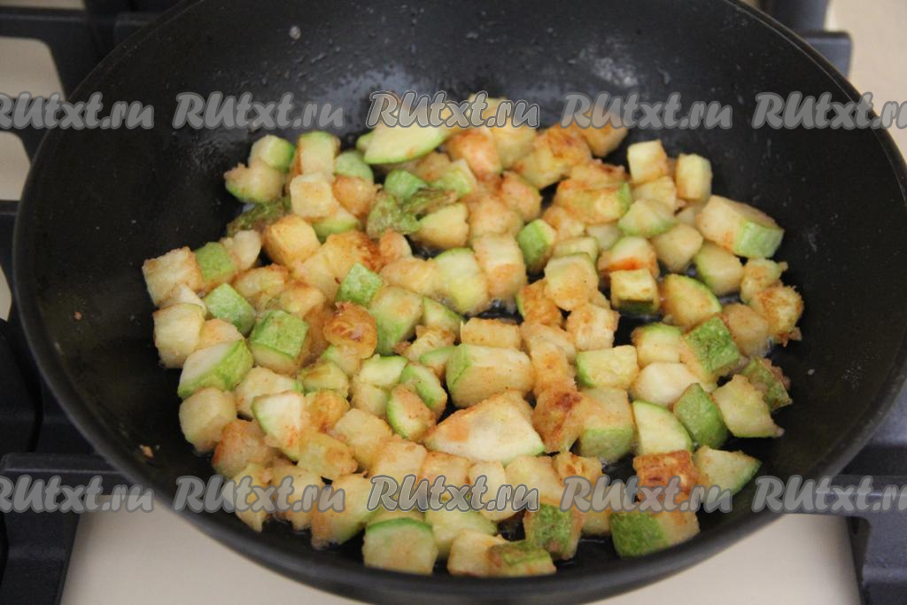 Обжарить кабачки, периодически перемешивая, до золотистого цвета со всех сторон (в течение 5-7 минут) на среднем огне.