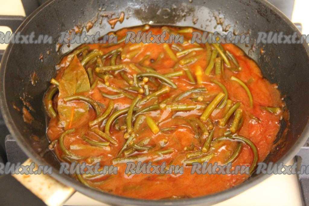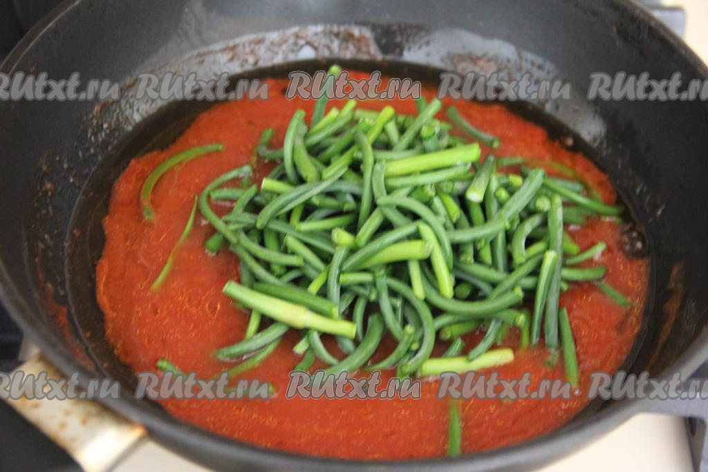 Стрелки чеснока нарезать на кусочки длиной примерно 3-4 сантиметров, выложить в сковороду с закипевшей томатной смесью, перемешать.