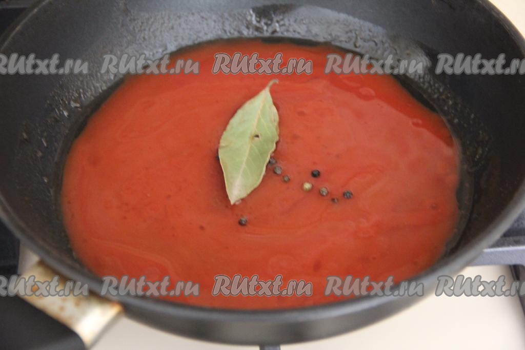 Добавить в сковороду лавровый лист, всыпать горошины душистого и чёрного перцев, довести до кипения.