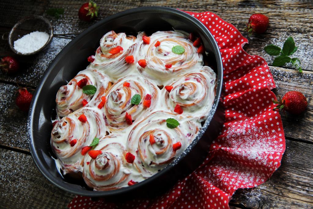 К домашнему чаепитию можно приготовить синнабоны с клубникой из дрожжевого теста. Булочки получаются очень воздушными, нежными, вкусными и ароматными. А благодаря творожному крему, которым смазываются горячие синнабоны, эта выпечка становится ещё и очень аппетитной. Всем советую приготовить синнабоны с клубникой для себя и своих близких!