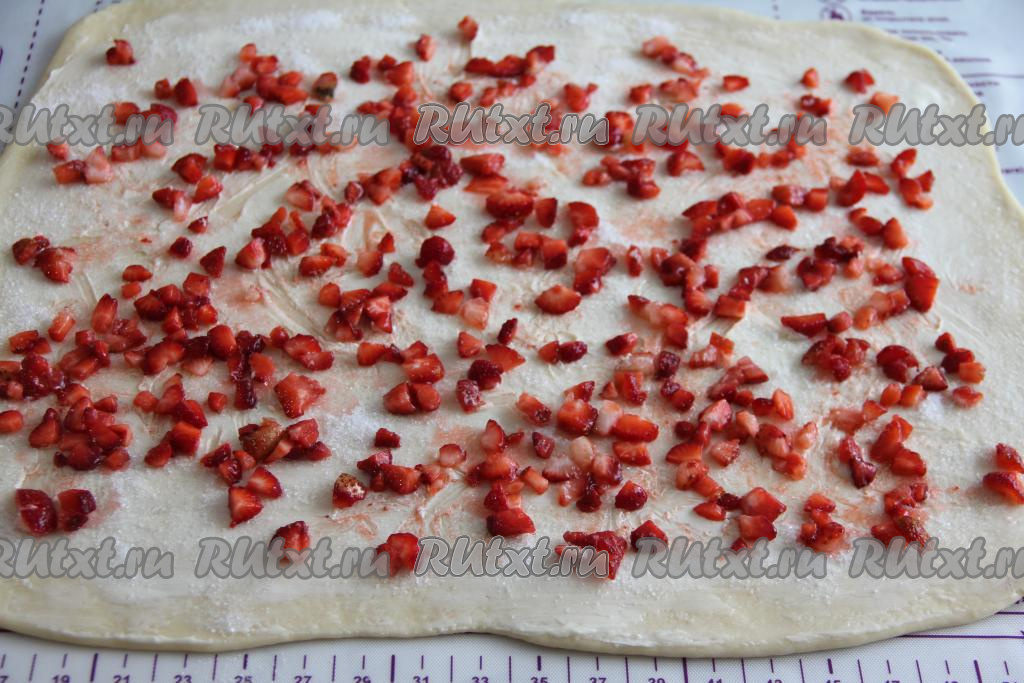 Свернуть тесто с клубникой в плотный рулет, начиная с длинной стороны.