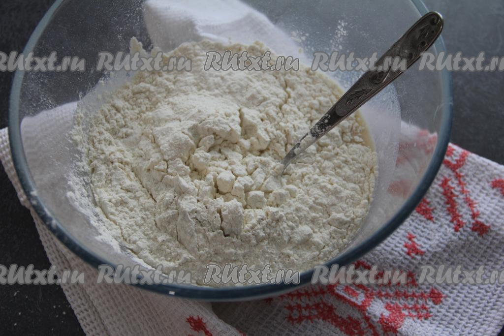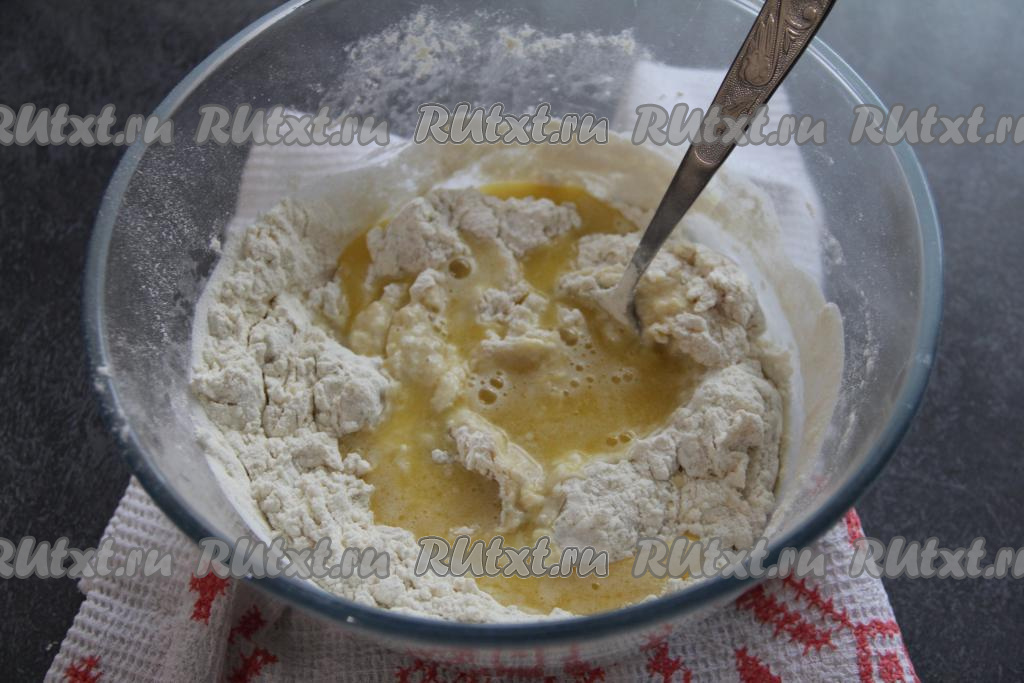 Добавить половину просеянной муки, перемешать тесто столовой ложкой.