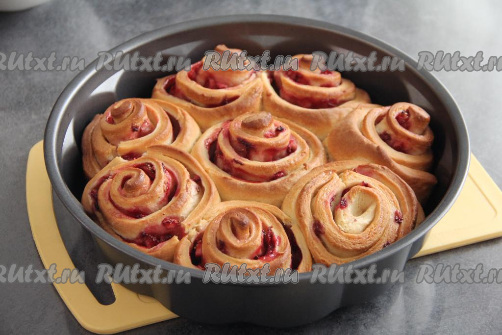 Выпекать синнабоны с клубникой в духовке, разогретой до 180 градусов, минут 35.