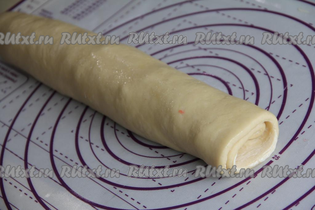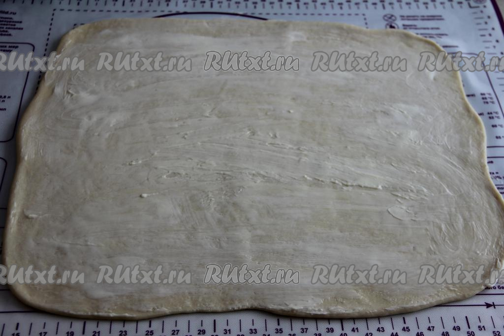 Обмять тесто, а затем раскатать его на присыпанную мукой поверхность в прямоугольный пласт, его толщина должна быть примерно 3 миллиметра. Смазать пласт 50 граммами мягкого сливочного масла.