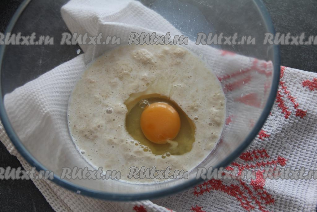 По прошествии времени опара покроется пузырями. В глубокой миске соединить опару, оставшийся сахар, сырое яйцо и соль, перемешать.