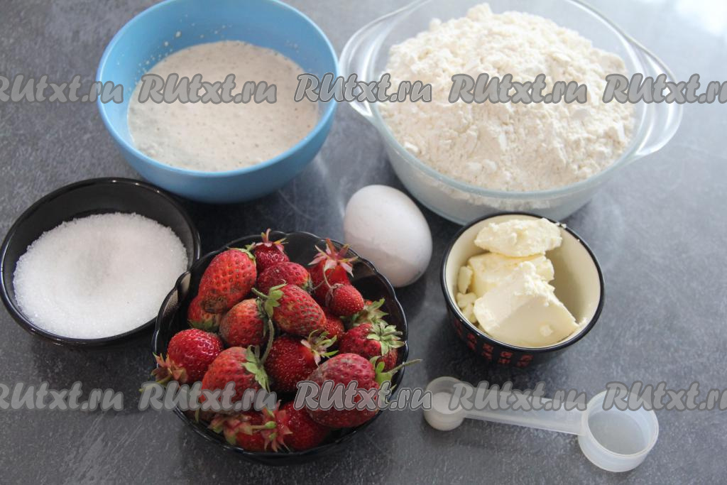 Подготовить продукты. 50 грамм сливочного масла для начинки должны быть комнатной температуры, поэтому из холодильника нужно достать заранее. Клубнику можно взять свежую или замороженную. Замороженные ягоды можно не размораживать. Свежую клубнику перебрать, удалить чашелистики, промыть под проточной водой, обсушить ягоды. Прежде всего замесим тесто. Для этого тёплое молоко, подогретое до 38-40 градусов, нужно влить в небольшую ёмкость, всыпать 1 чайную ложку сахара от общего количества, указанного в ингредиентах, и дрожжи, хорошо перемешать и оставить получившуюся опару на 10 минут.