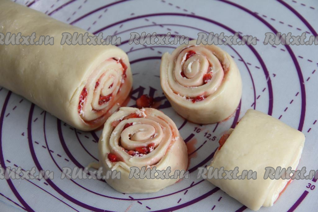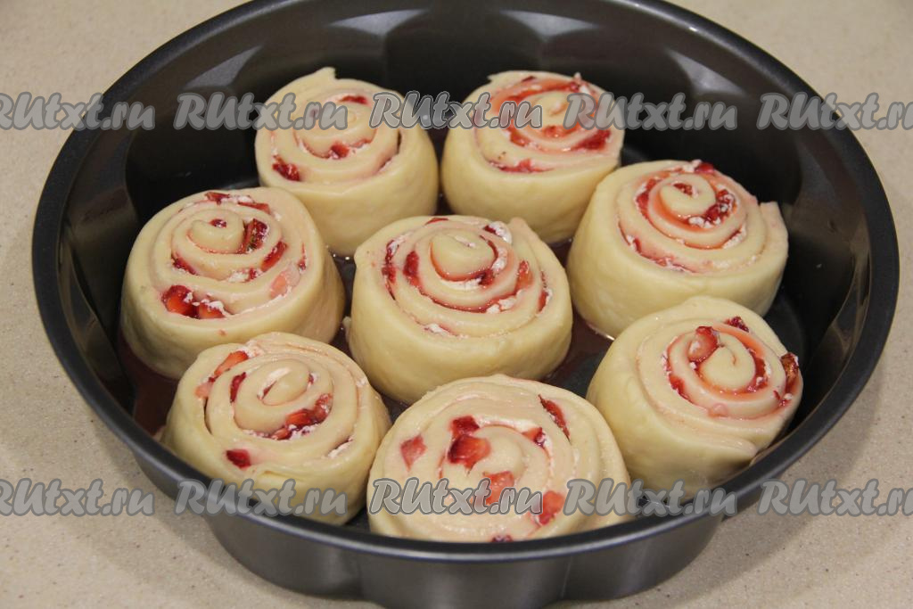 В форму для выпечки, смазанную растительным маслом, выложить на небольшом расстоянии друг от друга заготовки синнабонов с клубникой. Если нет подходящей формы, тогда можно выложить булочки на противень, застеленный пергаментом. Оставить заготовки булочек для подъёма в тепле минут на 30.