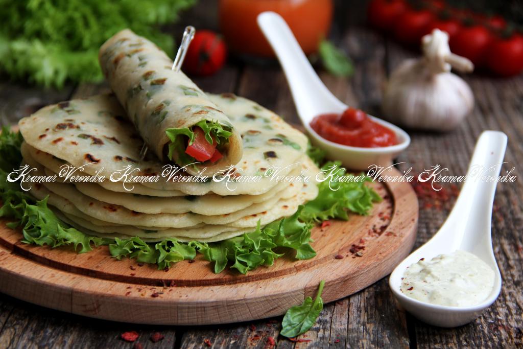 Мягкие, аппетитные постные бездрожжевые лепёшки, приготовленные с зеленью на сковороде, можно подать в качестве дополнения к супу или другим блюдам. Лепёшки получаются эластичными, поэтому в них можно заворачивать различные начинки. Отличным дополнением к ним станут различные соусы (например, томатный).