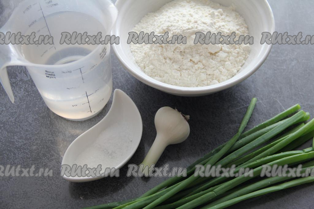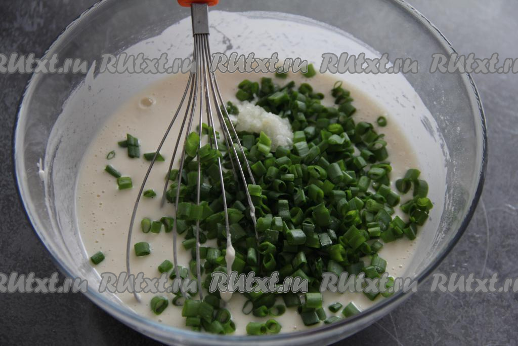Перемешать тесто венчиком. Зелёный лук (или другую зелень) мелко нарезать, чеснок пропустить через пресс. Добавить в тесто лук и чеснок, перемешать.