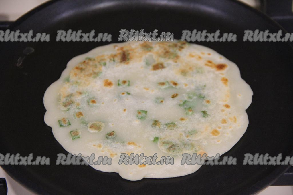 Сковороду разогреть и смазать растительным маслом. Выложить три столовых ложки теста, равномерно распределить, формируя круглую лепёшку диаметром 16-17 сантиметров.
