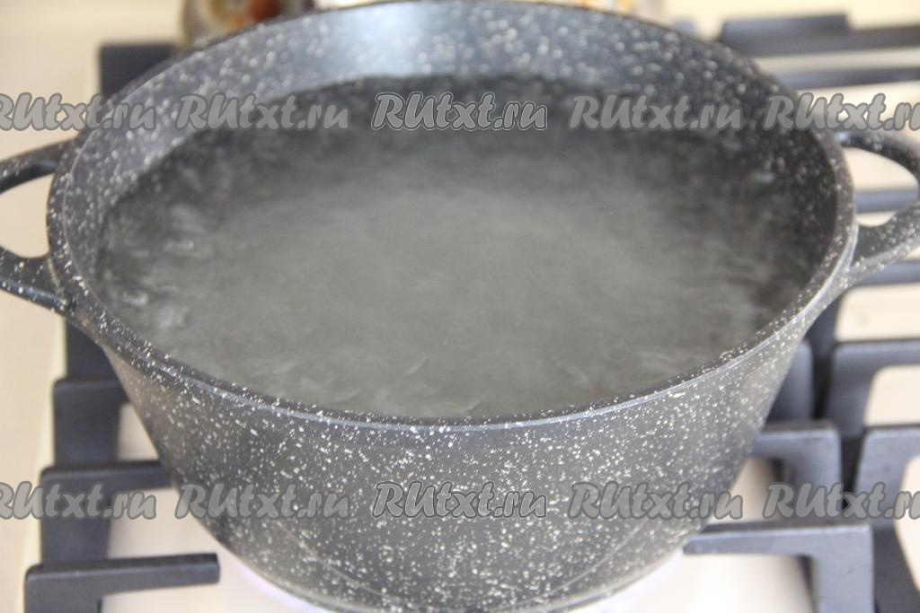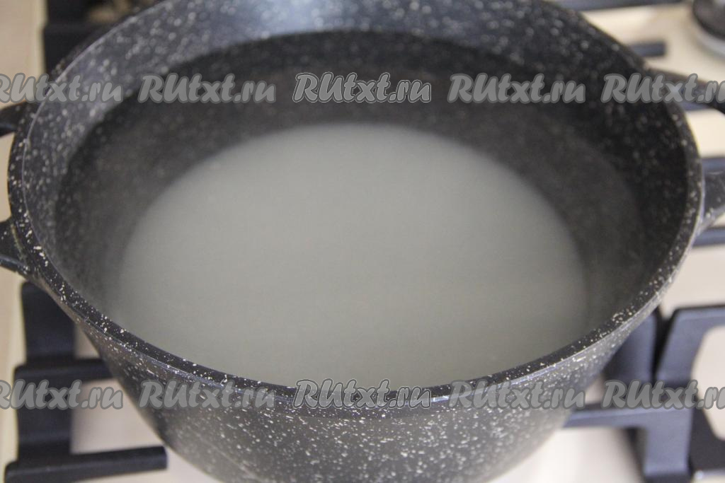 2,5 литра воды влить в кастрюлю, всыпать 400 грамм сахара, перемешать и поставить на достаточно сильный огонь, дать сиропу закипеть.