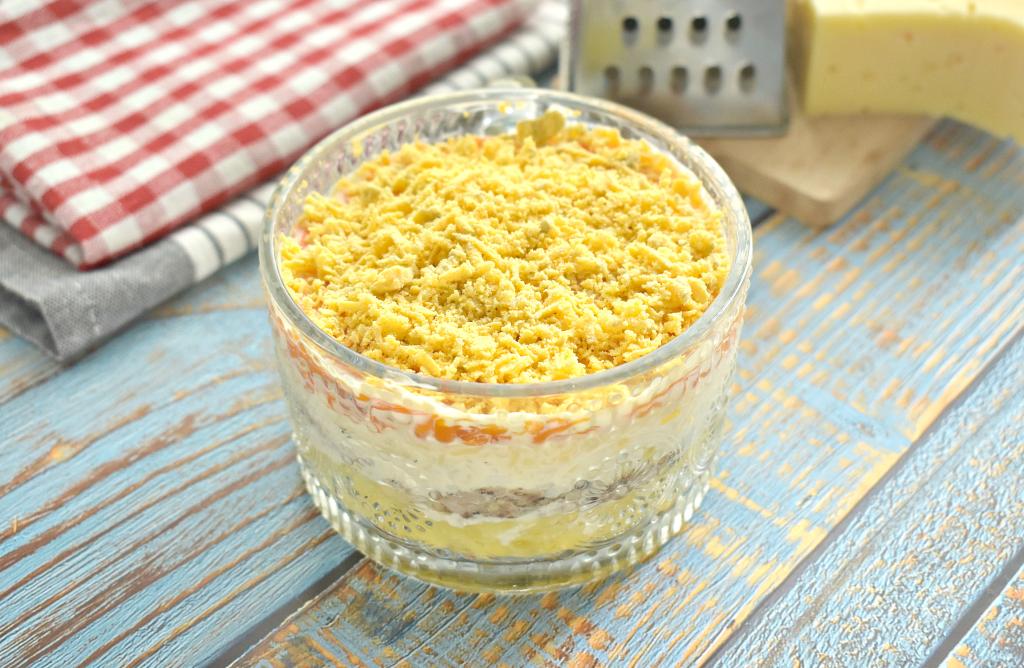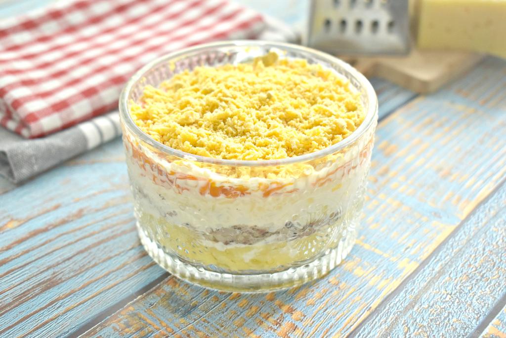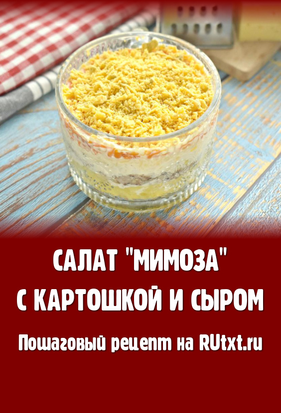 А затем сочный, сытный и очень вкусный салат "Мимоза", приготовленный с картошкой и сыром, можно подавать к столу.