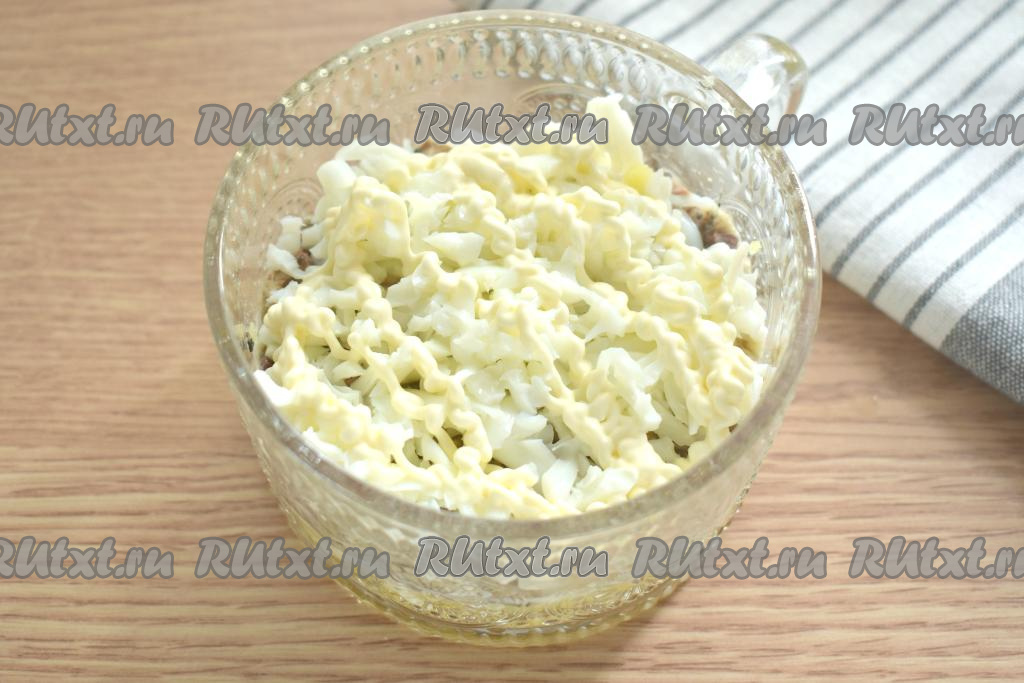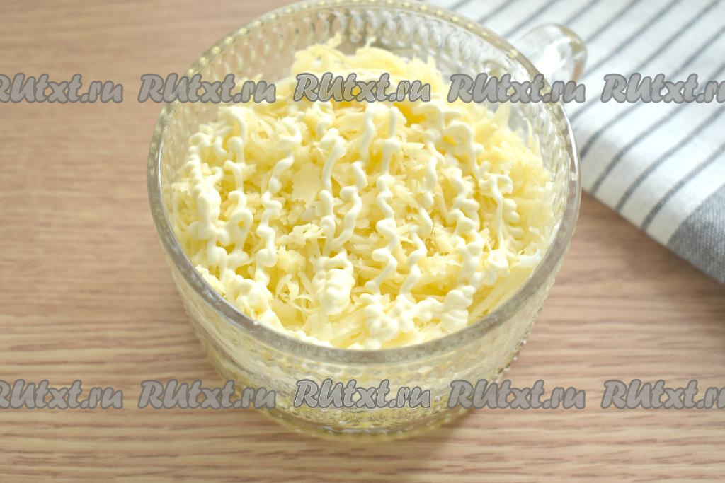 На слой из белков выкладываем сыр, натёртый на средней тёрке. Этот слой тоже смазываем майонезом.