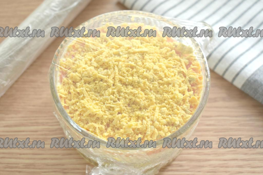 По традиции завершающим слоем салата "Мимоза" будет желток. Измельчаем его вилкой в крошку и выкладываем последним слоем.