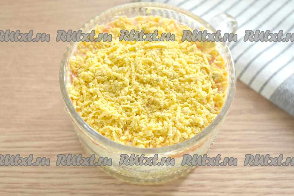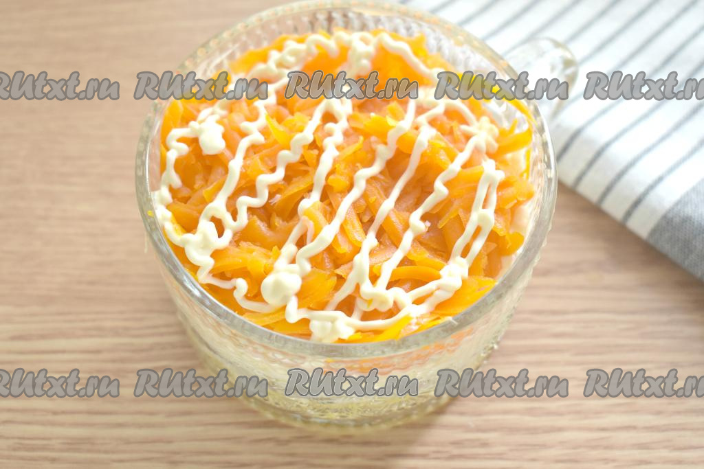Следующим слоем выкладываем натёртую на крупной тёрке морковку, смазываем немного майонезом.